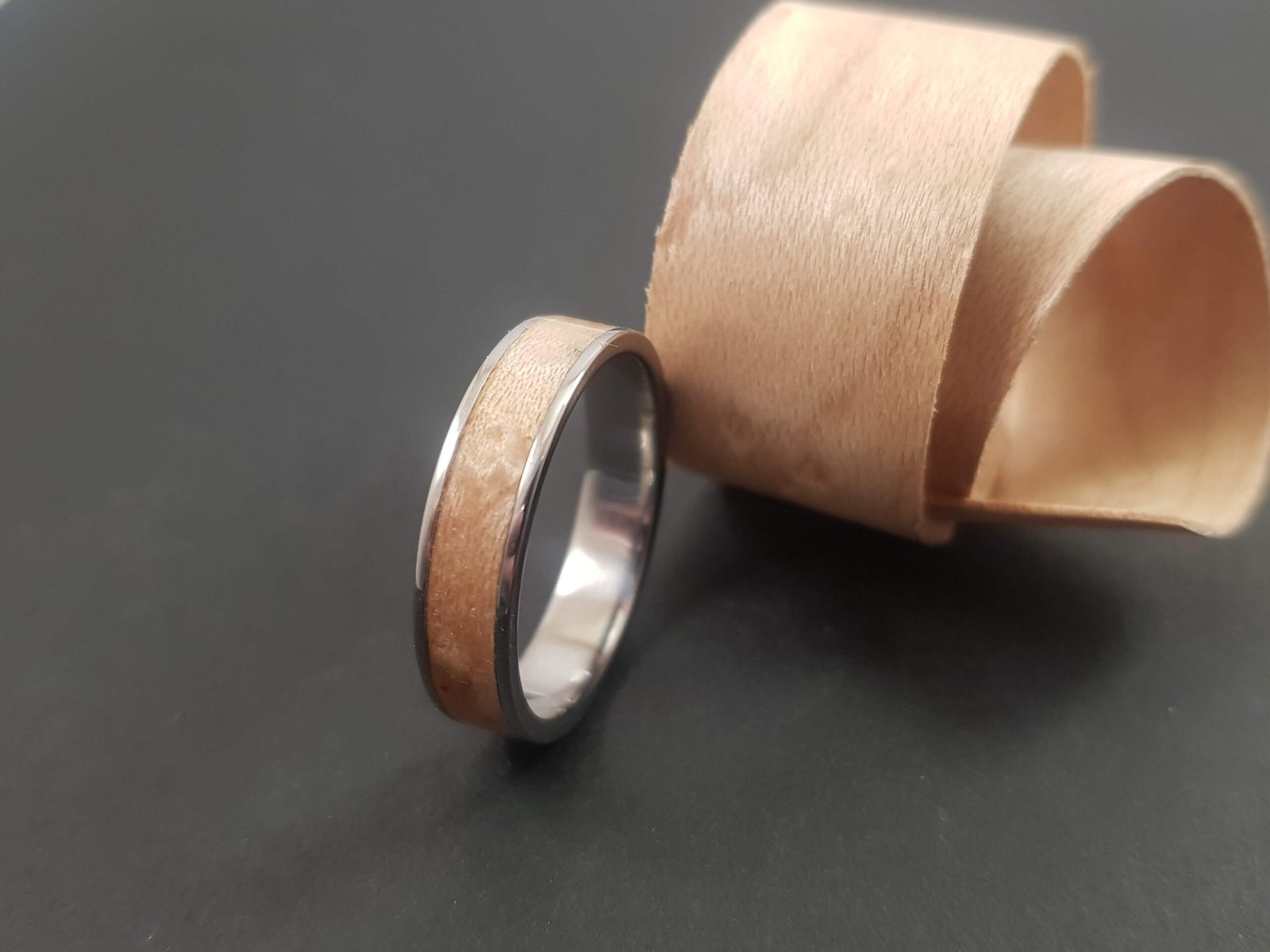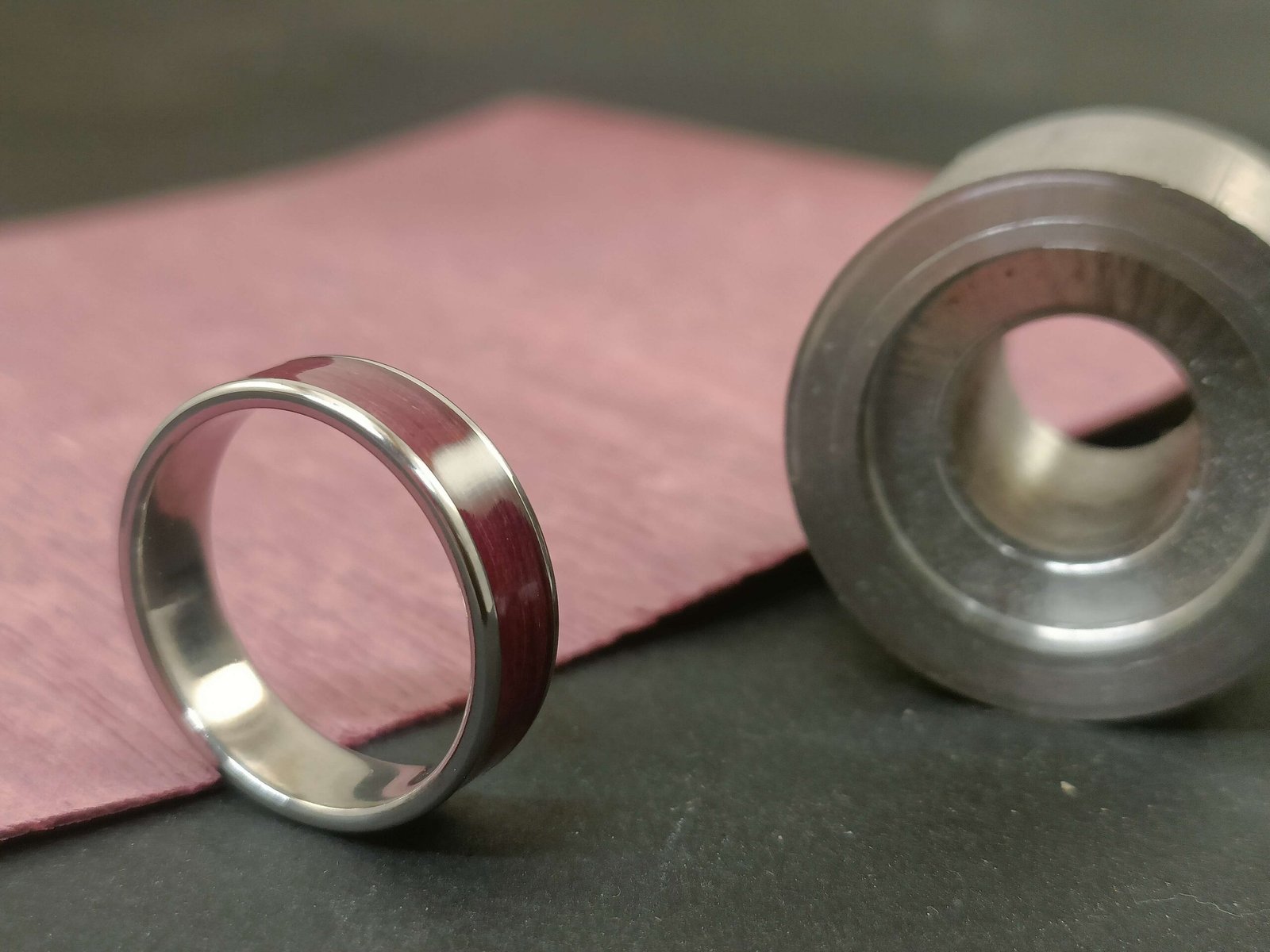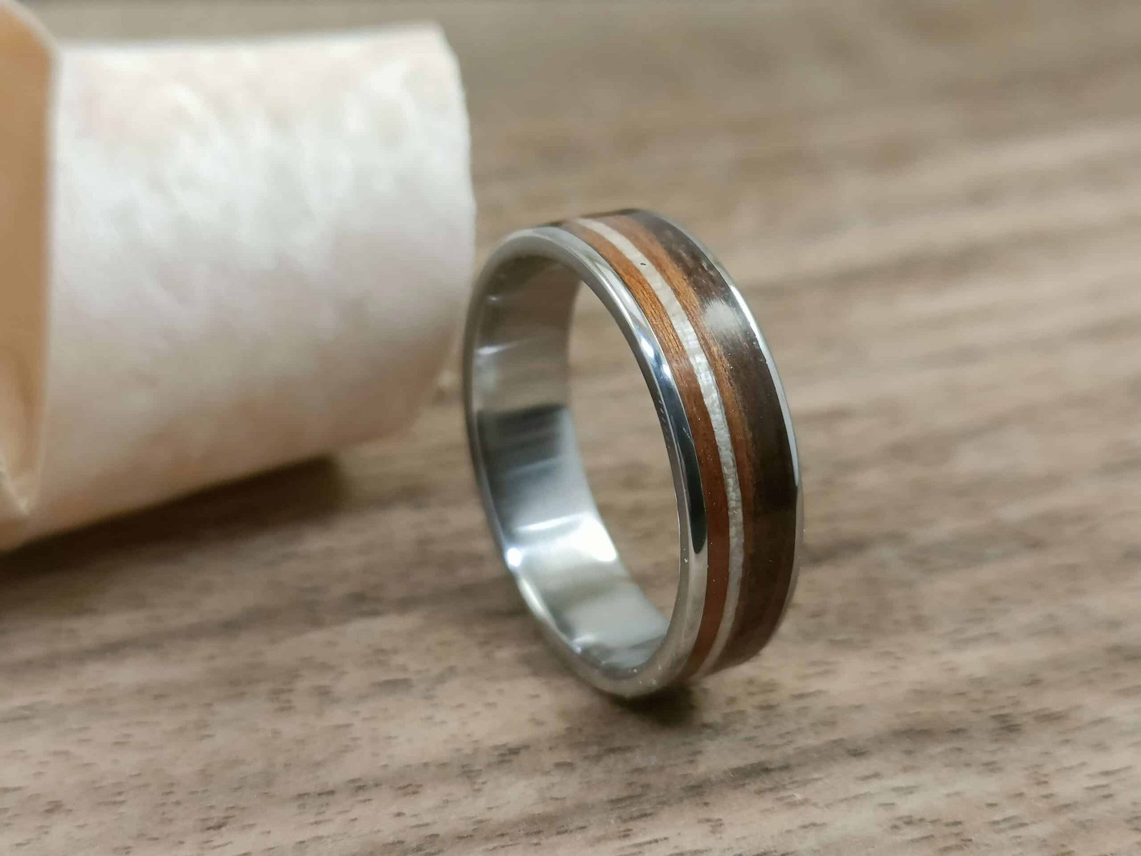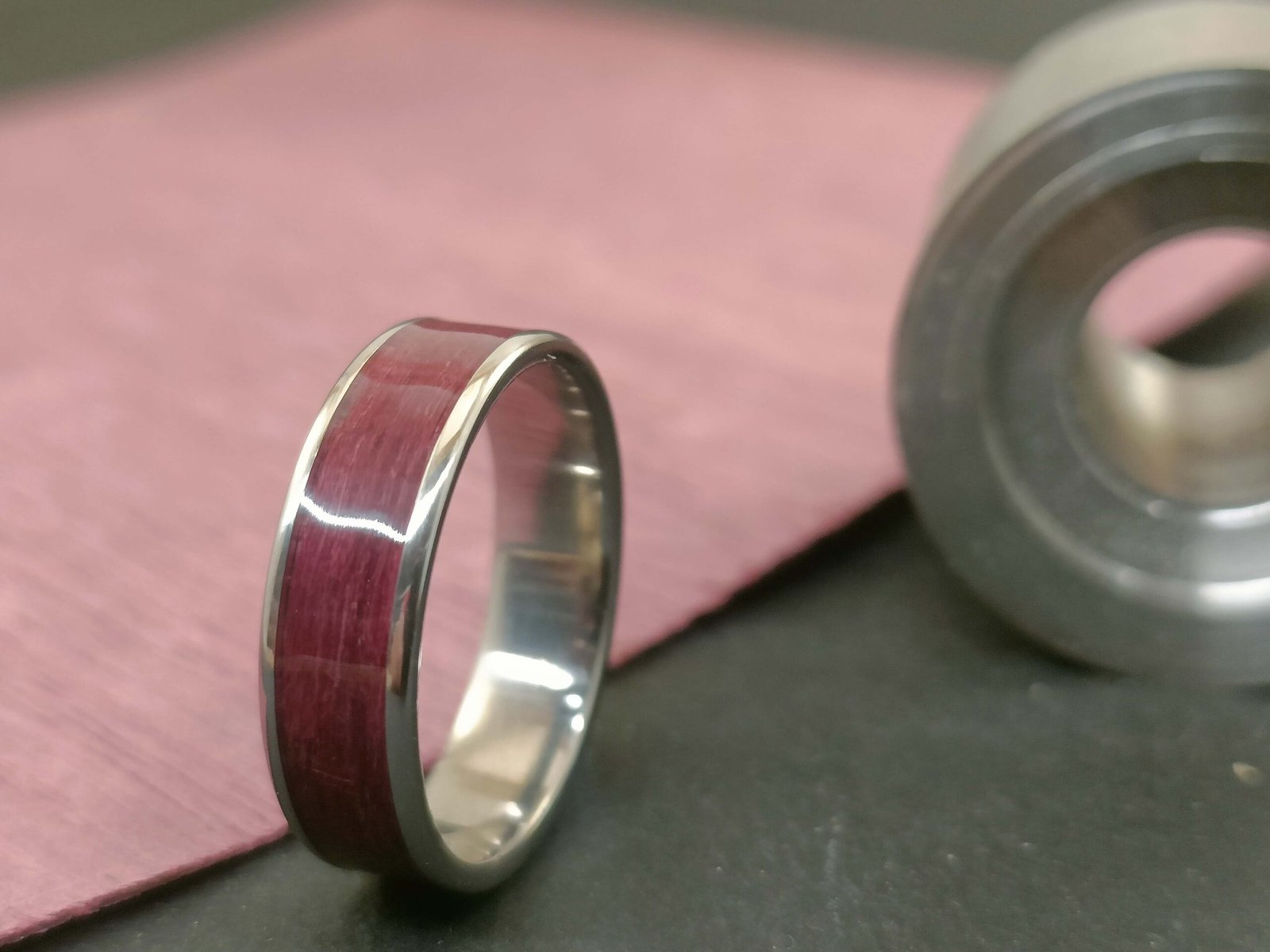Bague avec base en titane et incrustation de bois d’amarante.