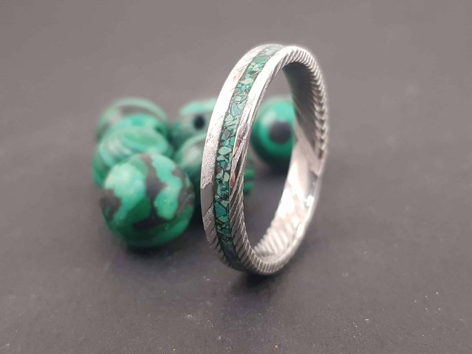 Les bagues sont réalisées en tournant le métal au tour puis les pierres sont concassées et incrustées.
