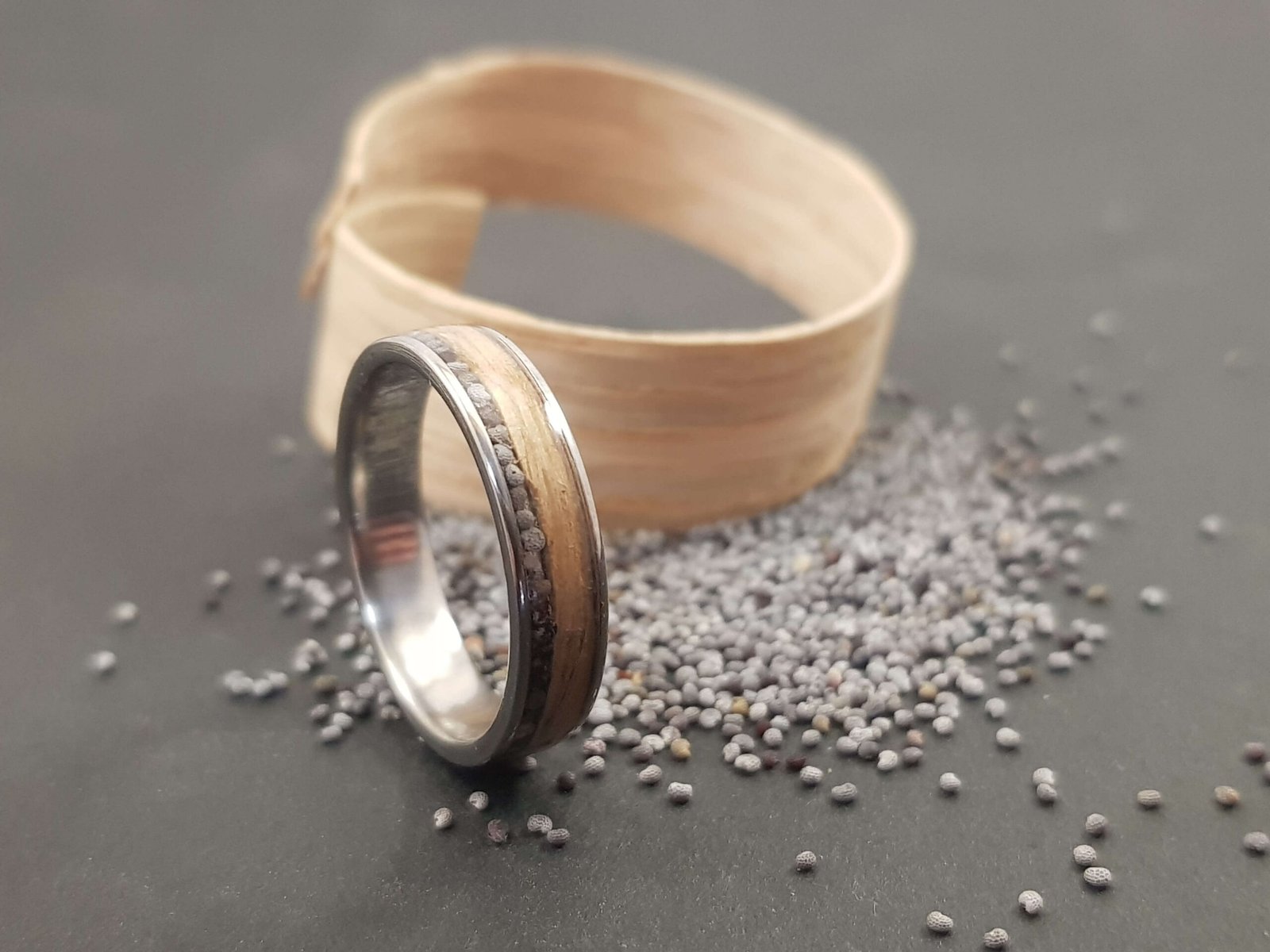 Bague en titane avec incrustation de chêne et épice au choix : sésame, pavot, piment ou paprika.