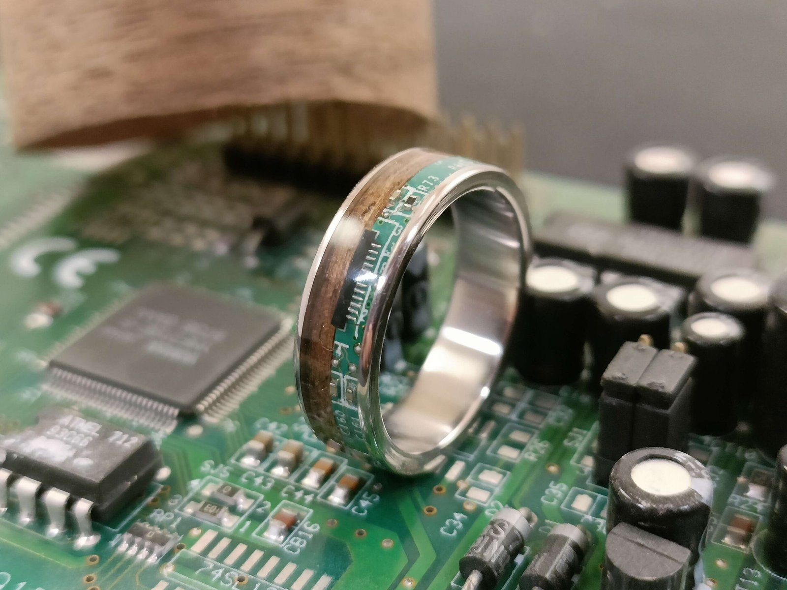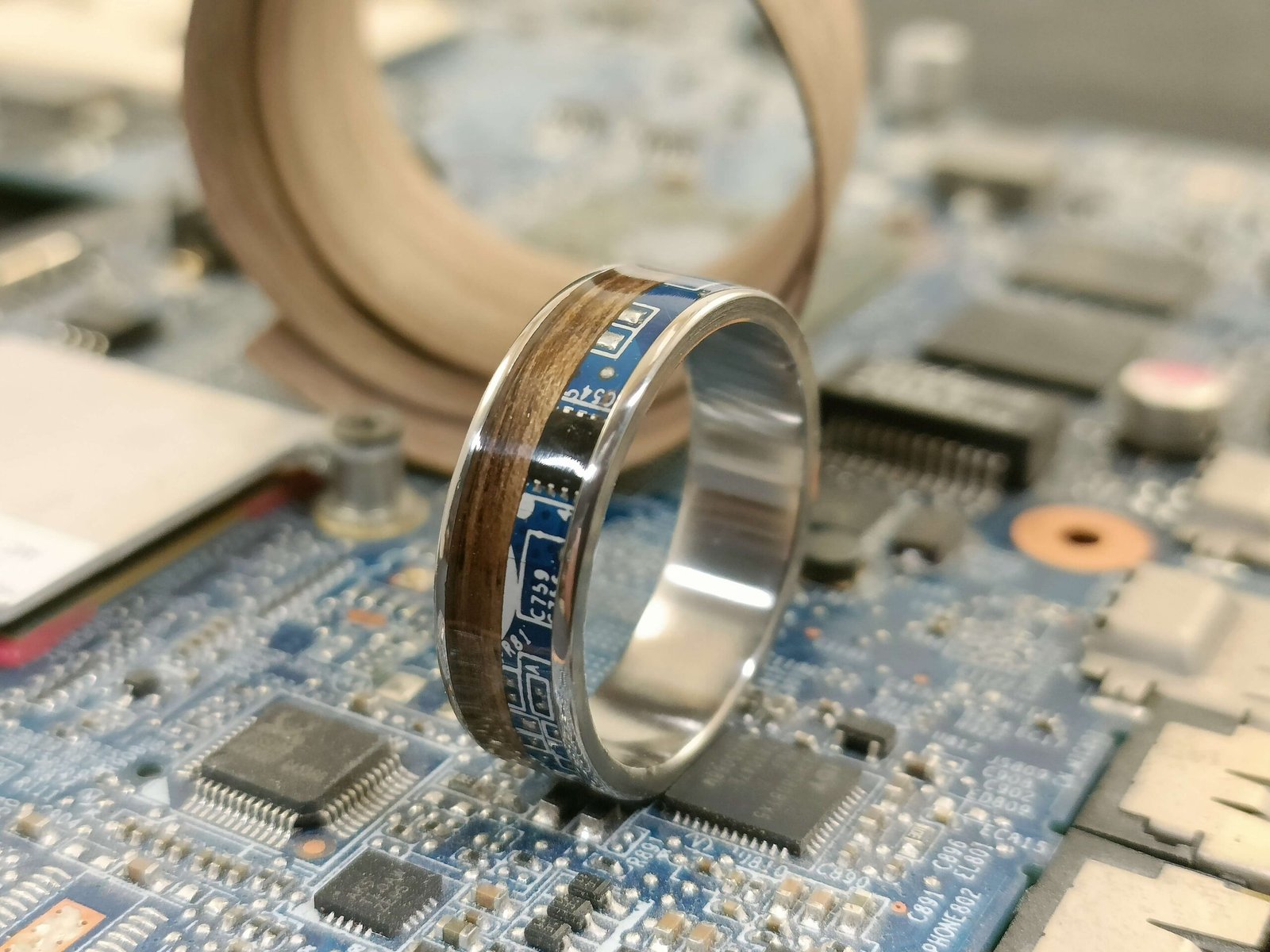 Bague en titane avec incrustation de bois de Noyer et vrai circuit imprimé recyclé bleu.