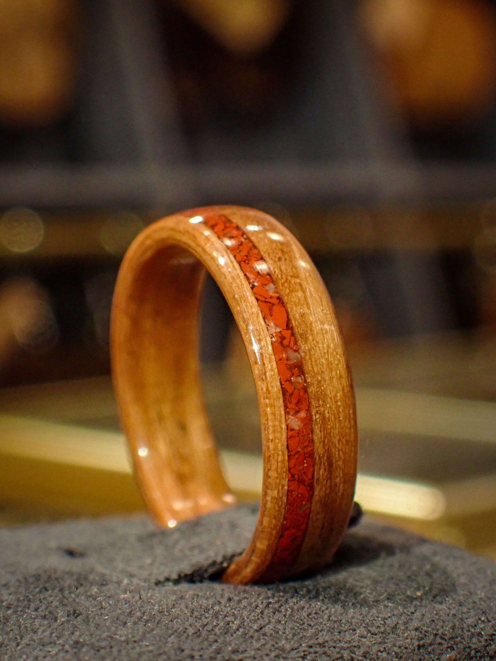 Chaque bague est façonnée artisanalement afin de mettre en valeur le caractère unique du bois.