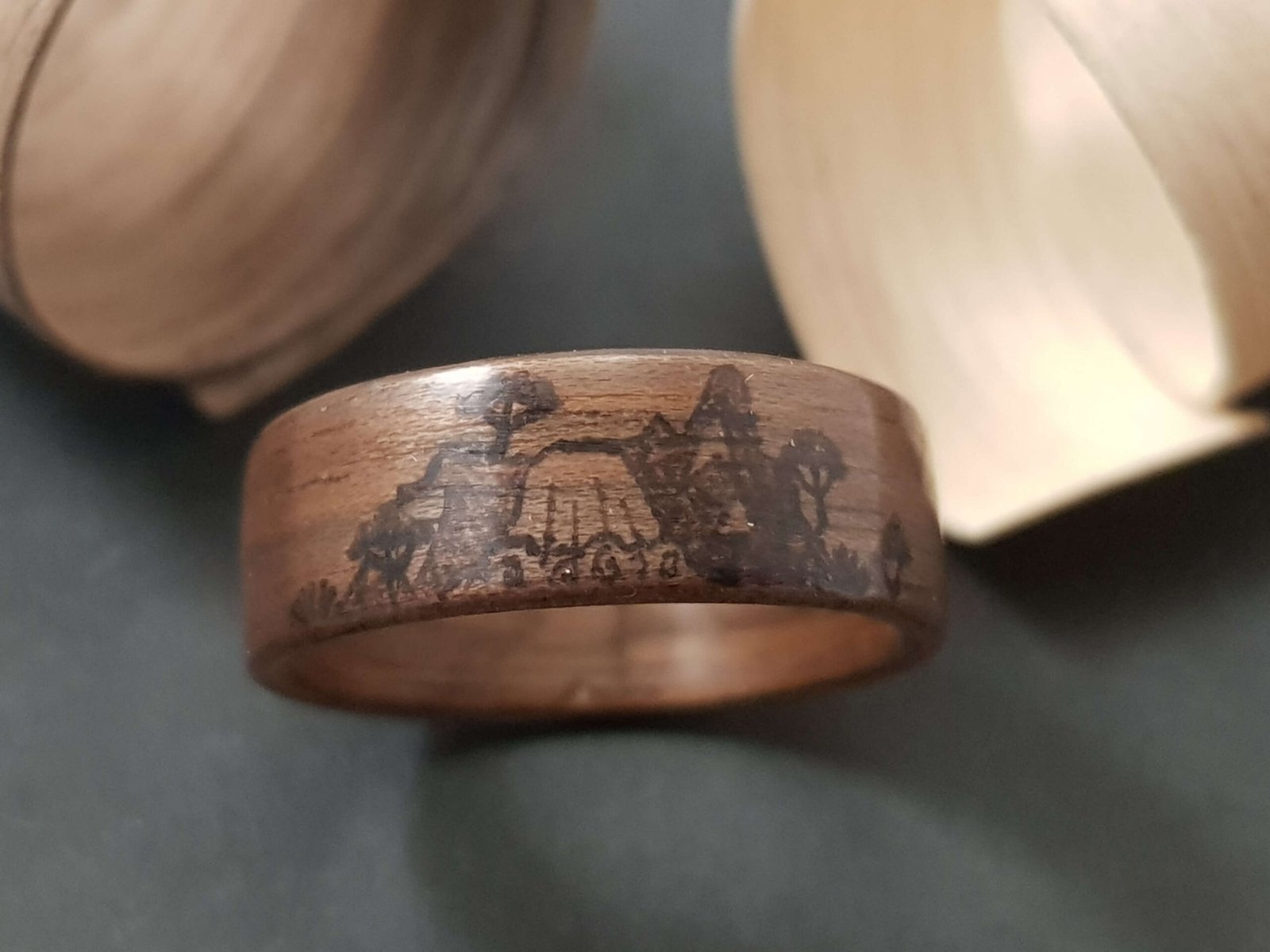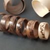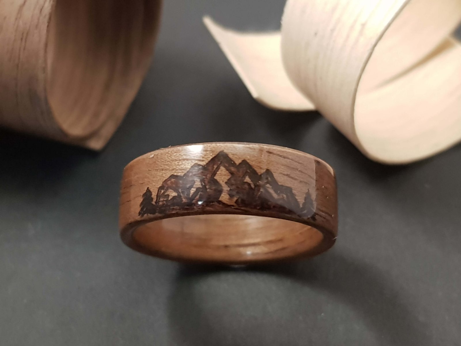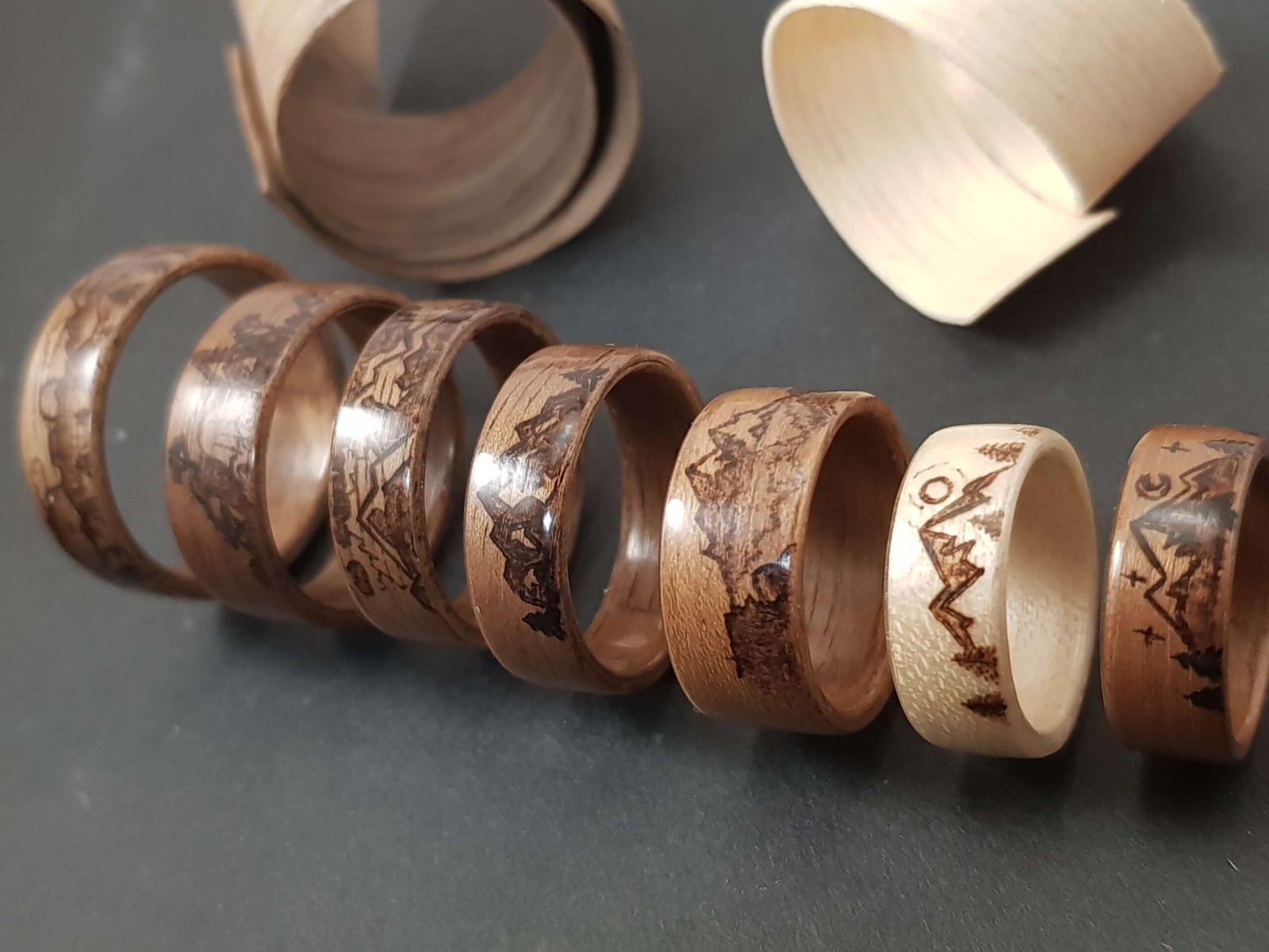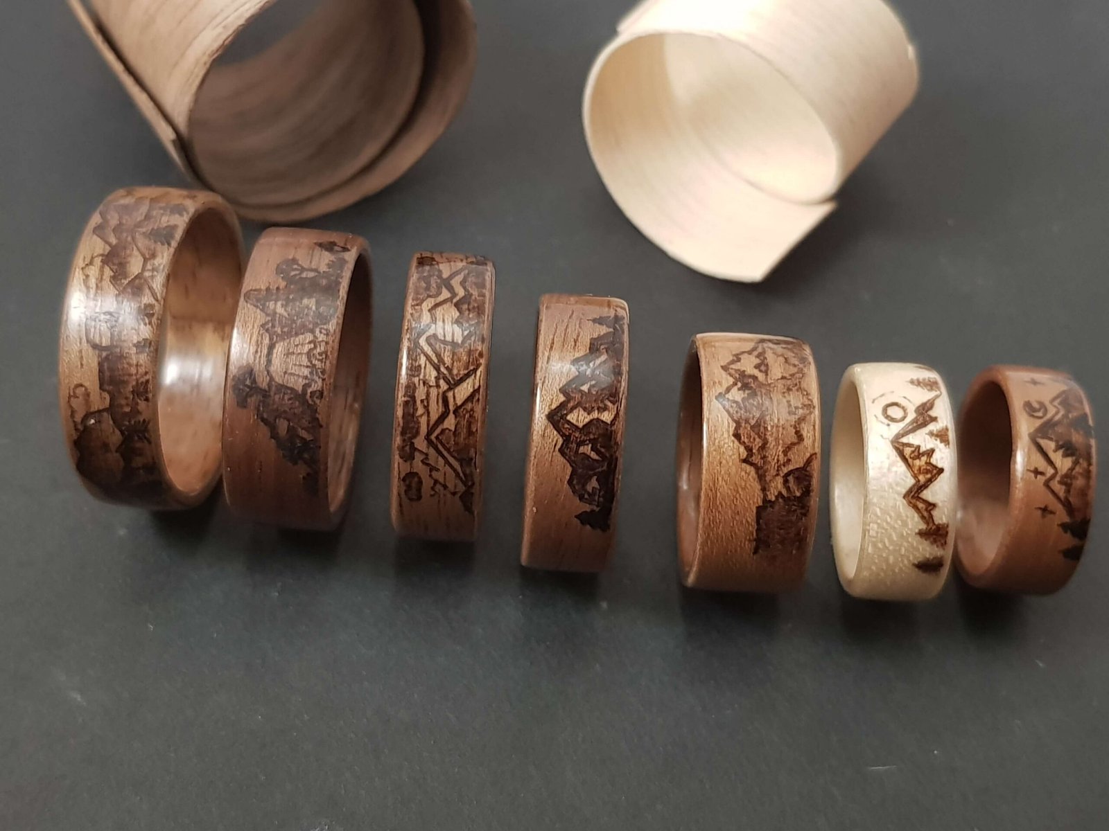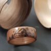 Bagues en noyer ou érable sycomore motifs montagne pyrogravés.