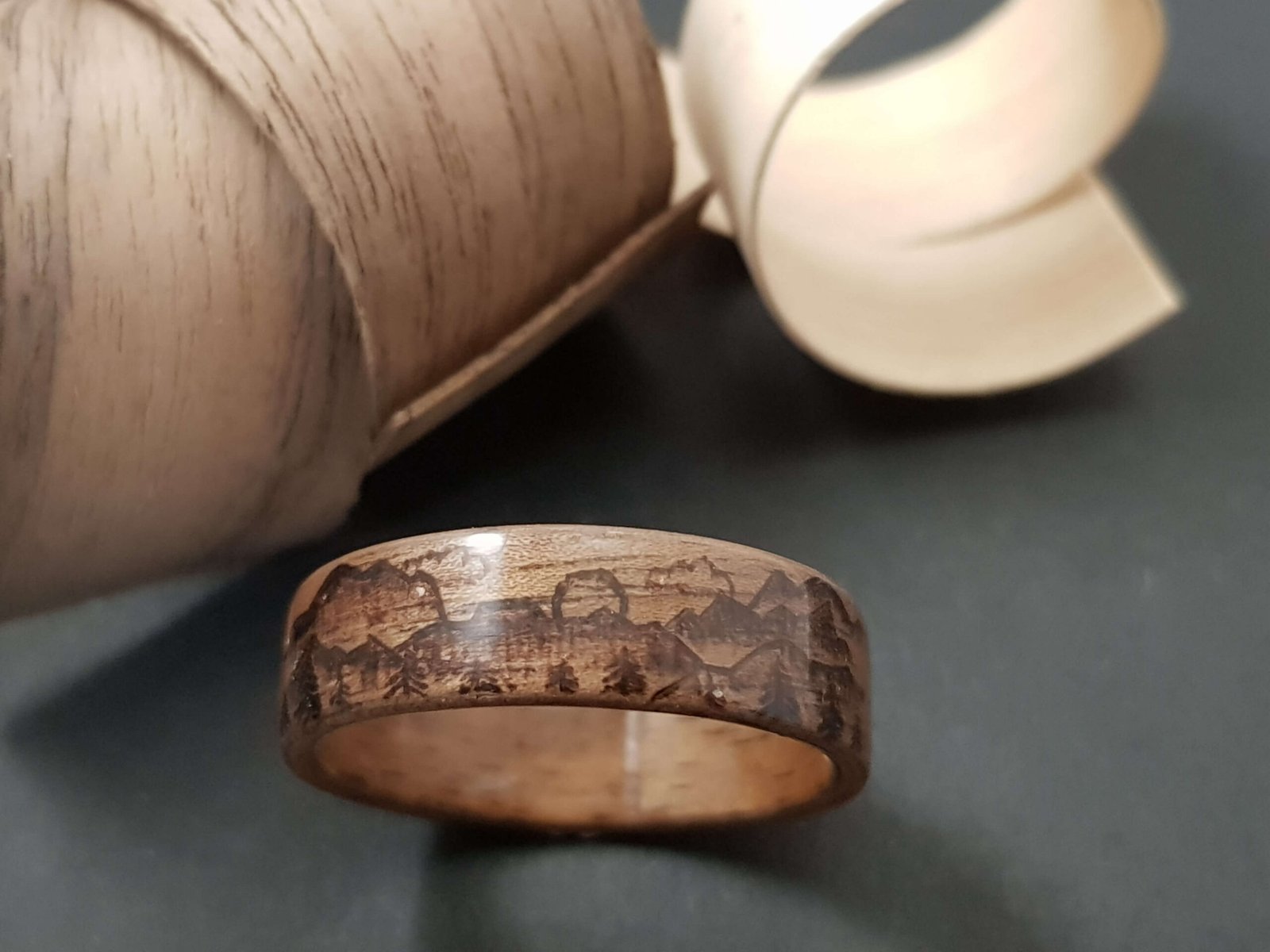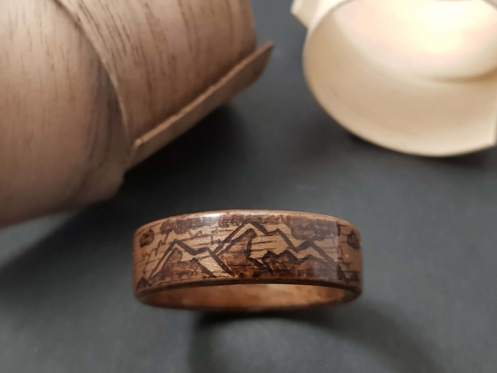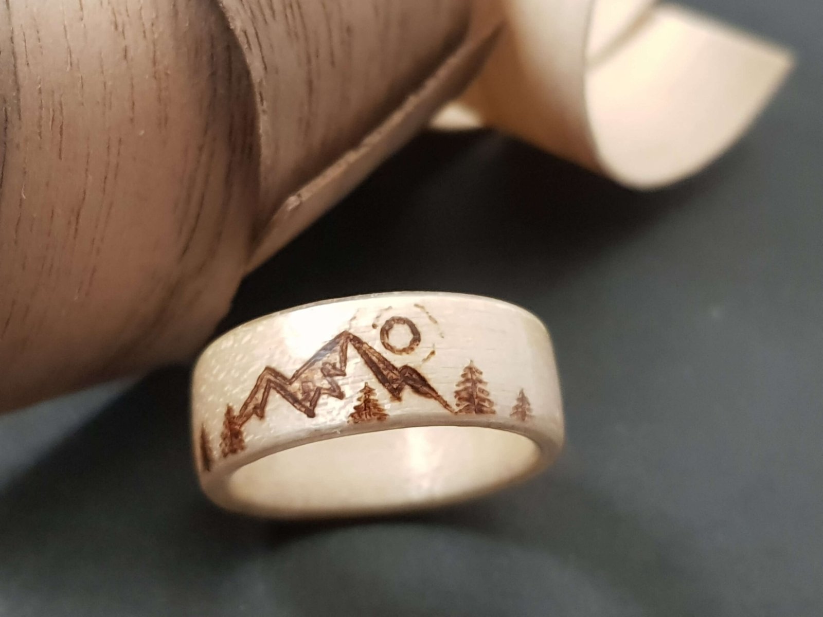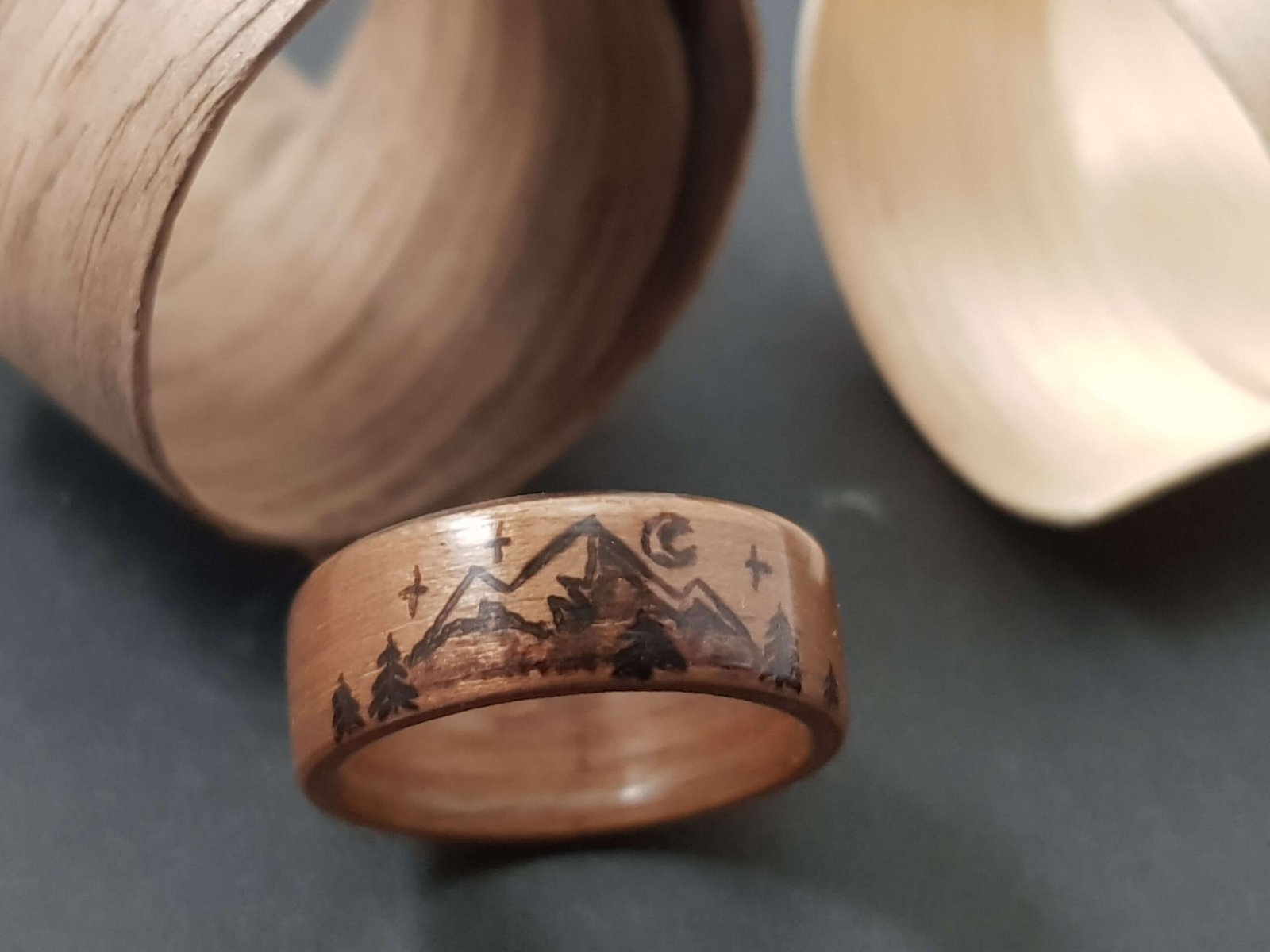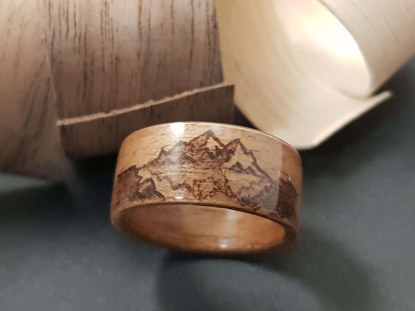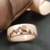Bague en bois et pyrogravure motif montagne