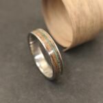 Bague en titane, bois et incrustation de pierres issues du recyclage de bijoux.