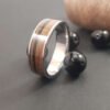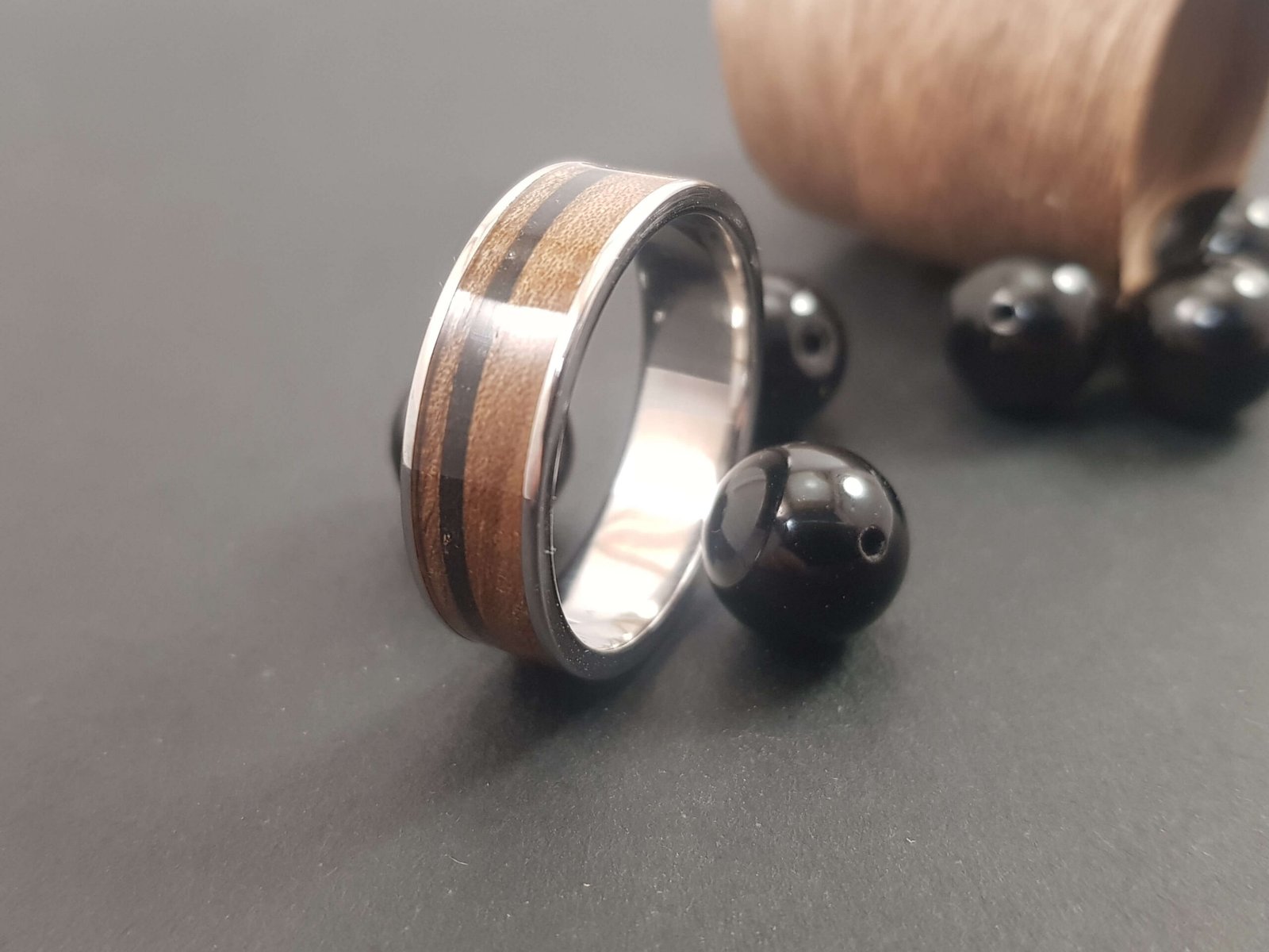 Bague en titane et noyer avec au choix un liseré de malachite ou onyx excentré.