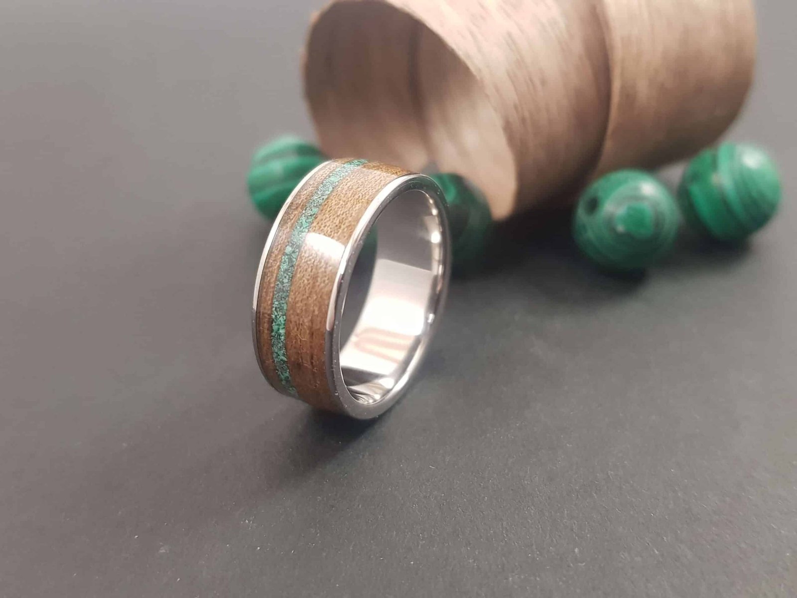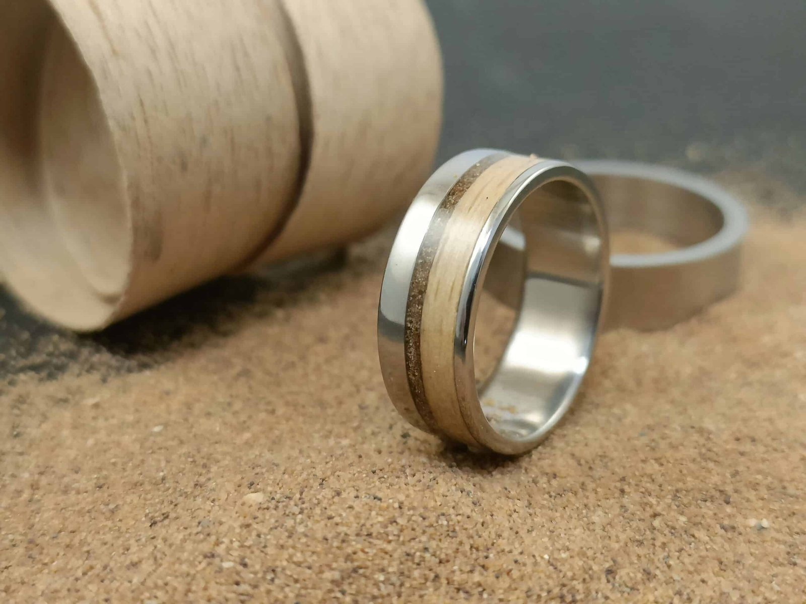 Bague Pacchi kari en titane avec incrustation de bois de hêtre et de sable rouge