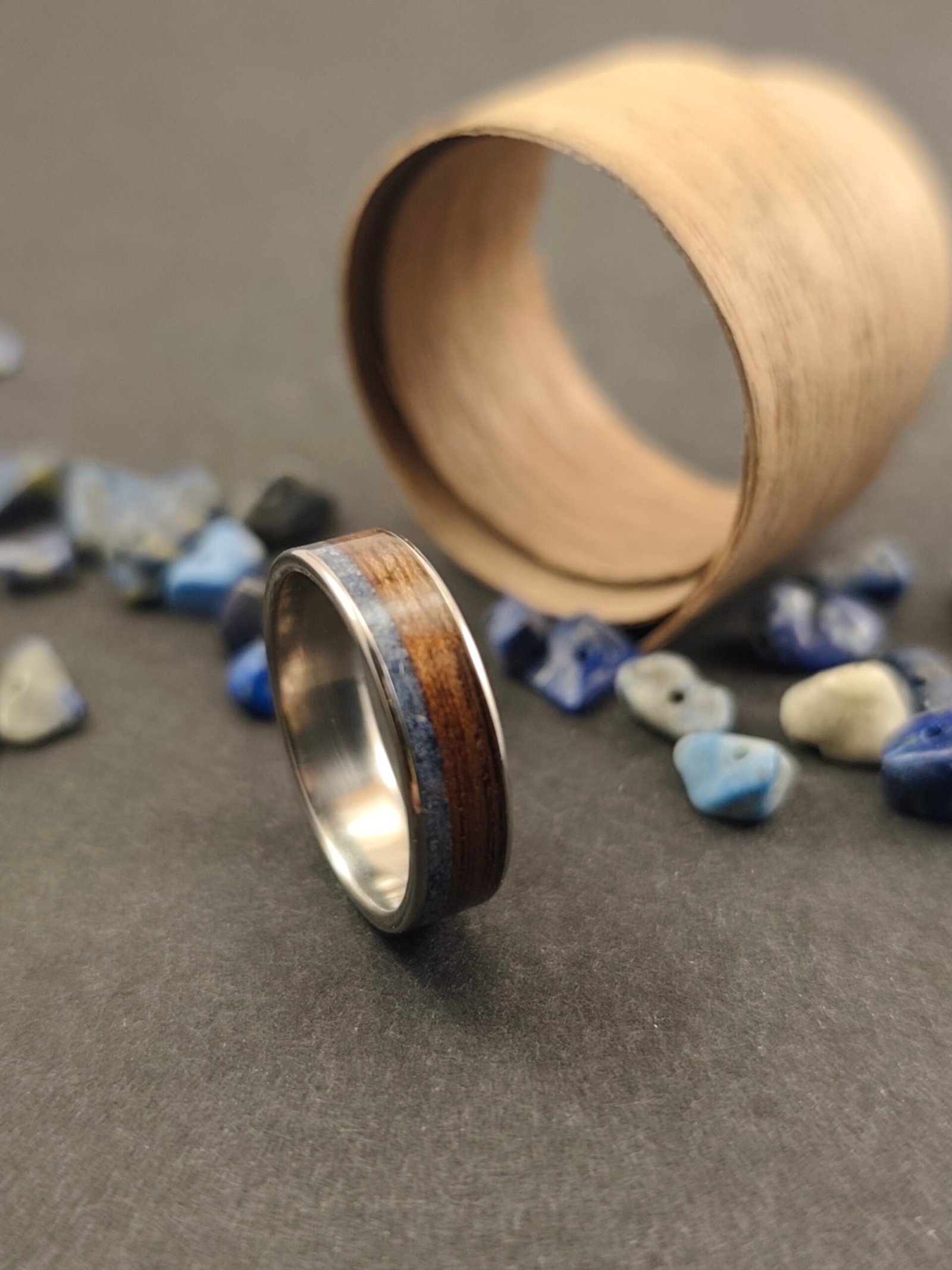 Bague en titane avec incrustation de noyer et de lapis-lazuli naturel.