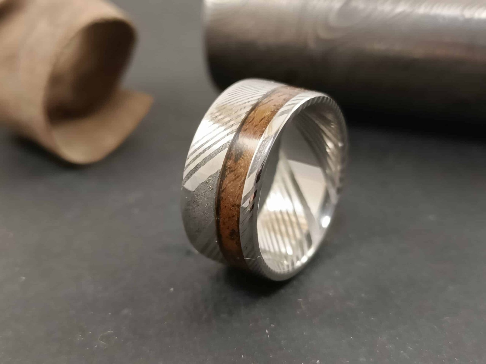 Les bagues sont réalisées sur mesure au tour à métaux. Le bois est découpé, intégré dans la bague et verni.
