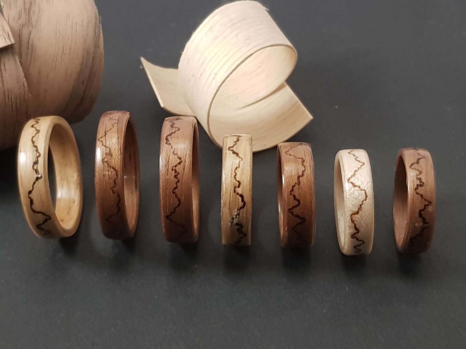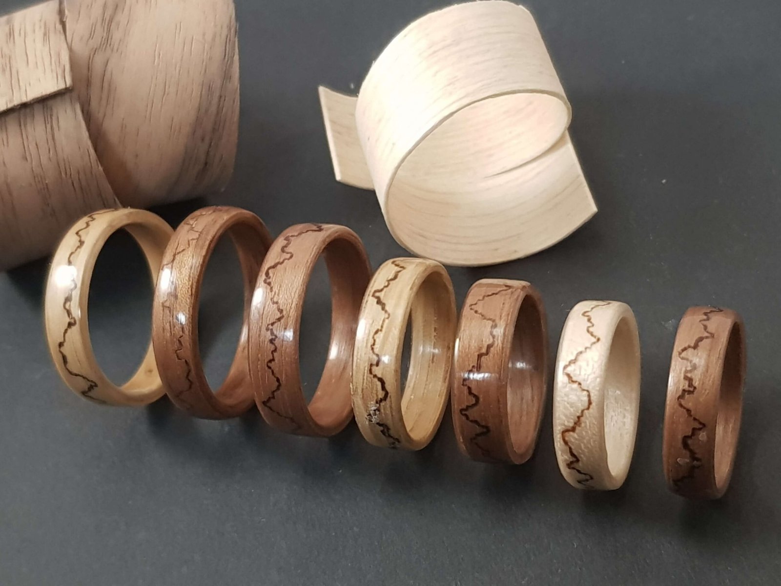 Bagues en noyer, chêne ou érable sycomore motifs montagne pyrogravés.
