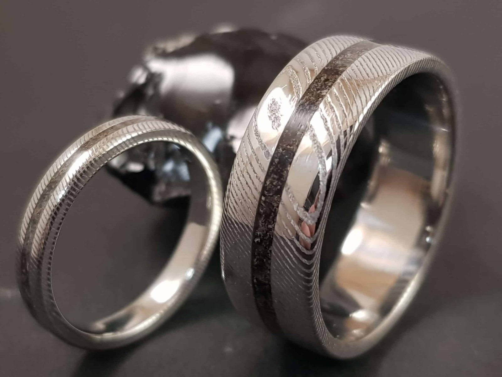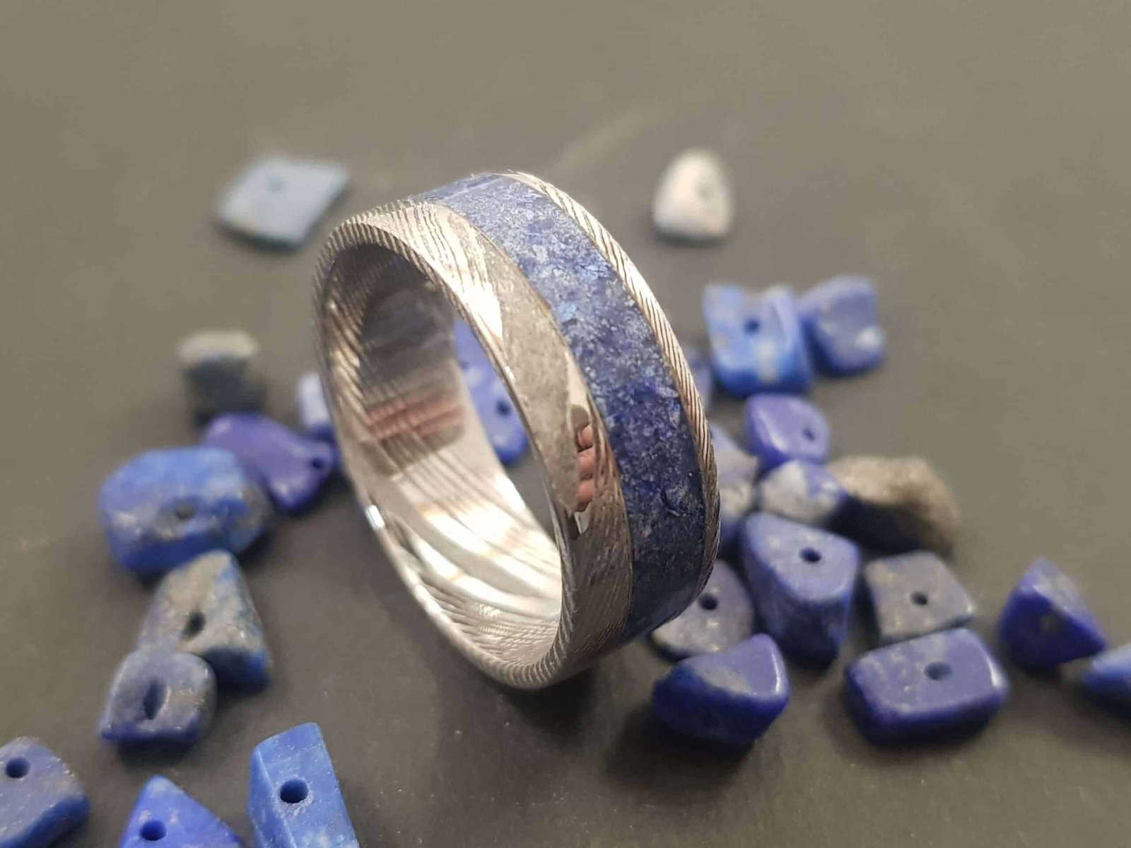 Bague en acier damassé et incrustation d’anthracite concassée.